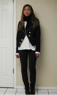 Forever 21 blazer, white striped tee, and scarf. Express grey knit skinnies and Jeffrey Campbell Riser oxfords. Erika is lucky – she works at a law firm where staff can wear young & trendy stuff every day! Tres chic!
