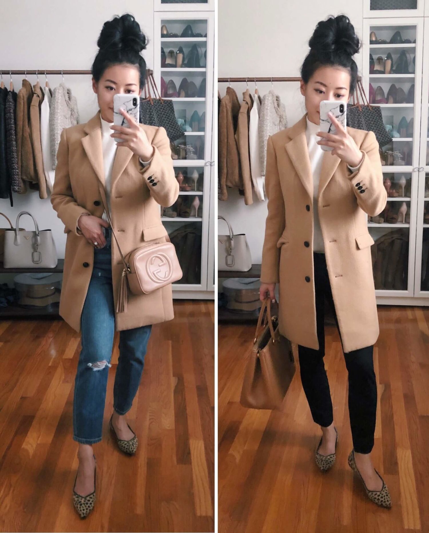 Left: J.Crew coat xxs petite (very similar), Express jeans 00 short, Gucci bag